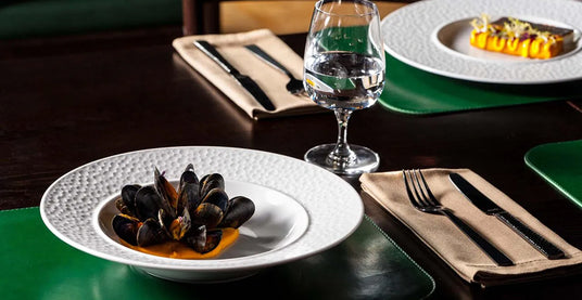 This collection draws on the jewellery technique of metal hammering. The wide rims of the plates are decorated with a texture inspired by hand-shaped metal, giving them an intriguing, modern character. The products are fully adapted for intensive use. Hammering combines functionality with a designer touch, making it an excellent choice for restaurants and hotels.